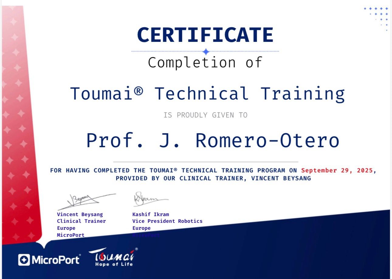 Recientemente he sido acreditado como proctor en cirugía robótica para el sistema Toumai, por parte de MicroPort y Medicina Analítica Consumibles (MAC). Recibo esta acreditación con ilusión, orgullo y agradecimiento, pero también con la responsabilidad que implica acompañar a otros equipos en el desarrollo de sus programas de cirugía robótica.